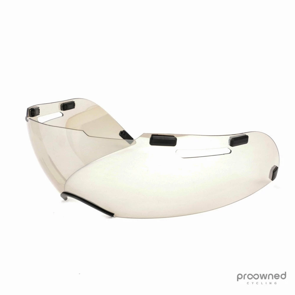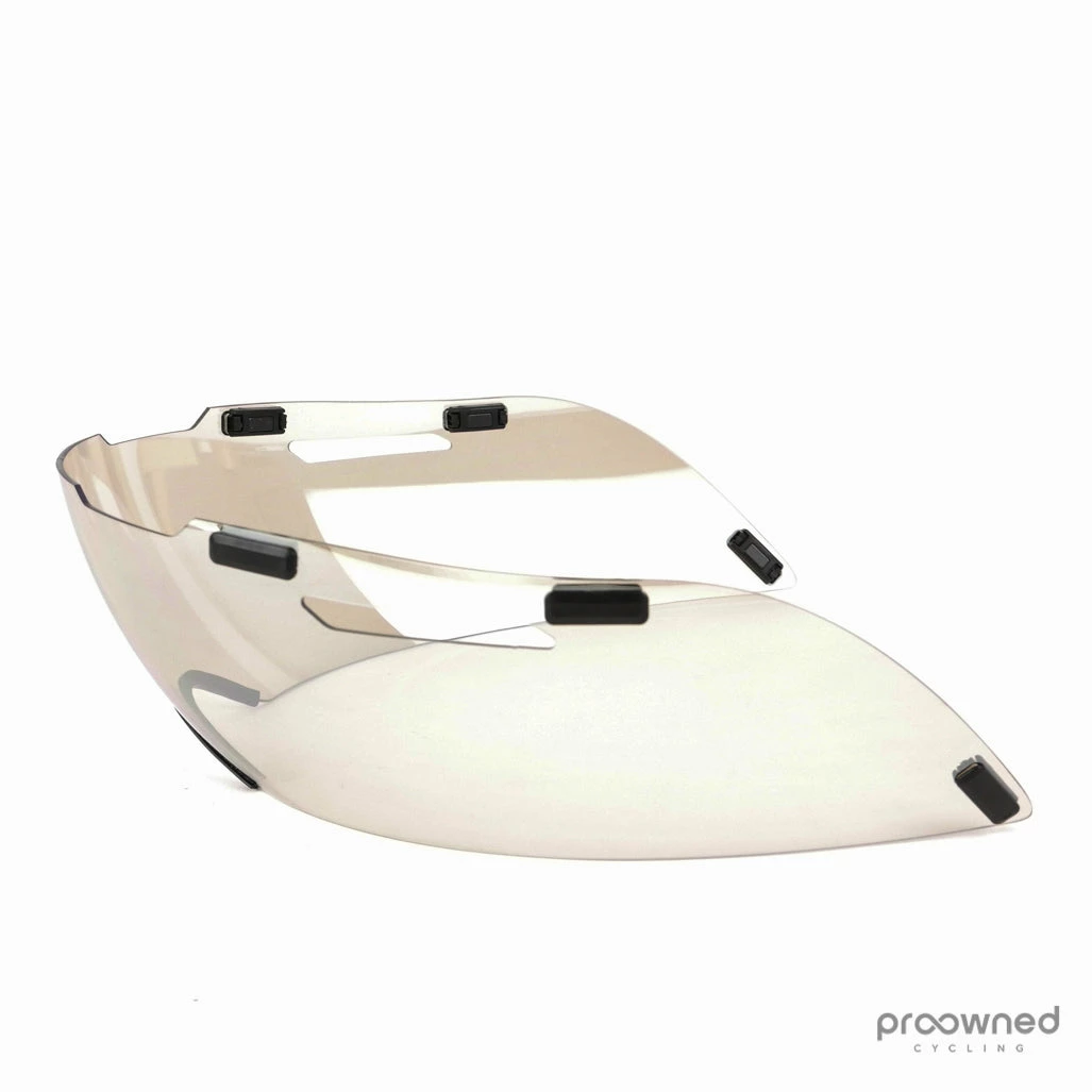 Original Lens for the Giro Aerohead time trial helmet. The visor is made for low light conditions. It is clear with a silver tint. The lens is made using Carl Zeiss technology to ensure exceptional optical precision and clarity. The lens is fixed to the helmet using magnets.