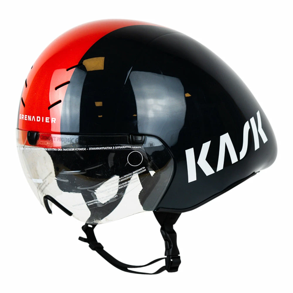 Kask Beluga R. Dennis Time Trial helmet by Ineos Grenadiers is as aerodynamic as possible due to the reduction in air resistance that occurs when riding. The helmet provides ample protection during the fall since no rider can safely stay in the same position for the entire race.