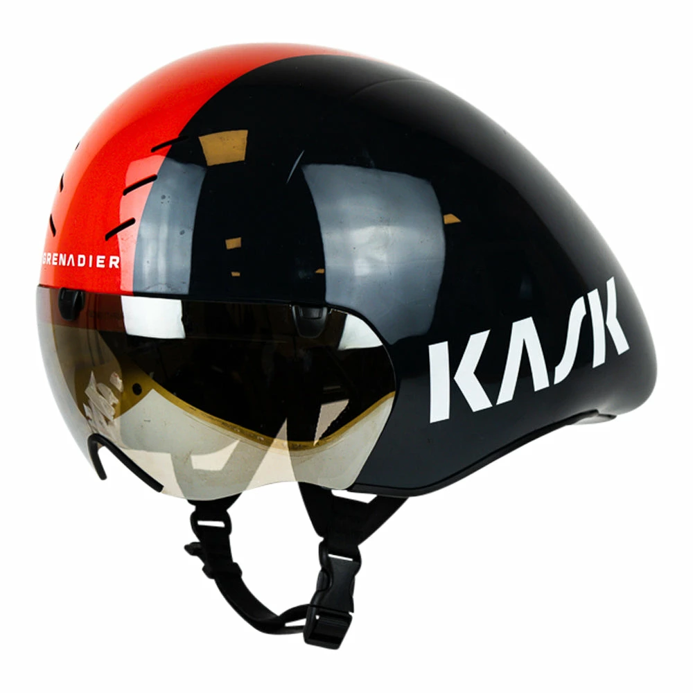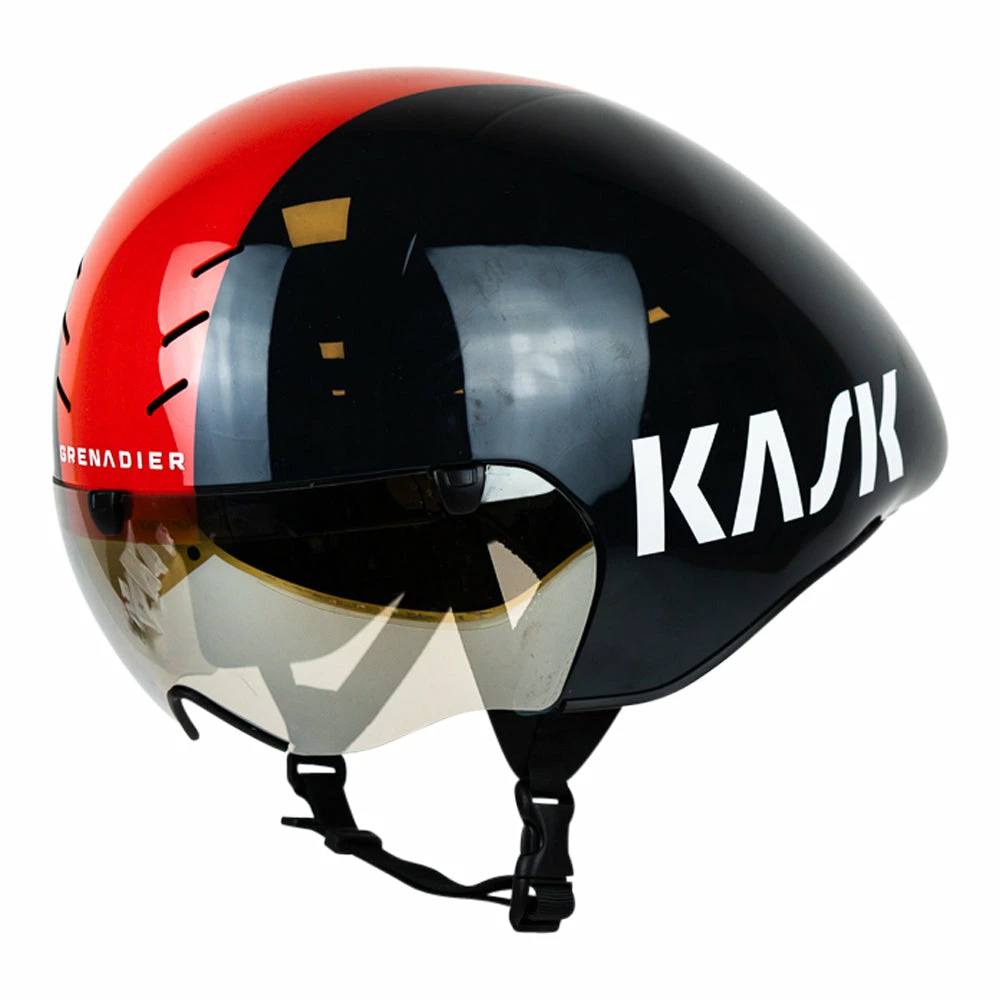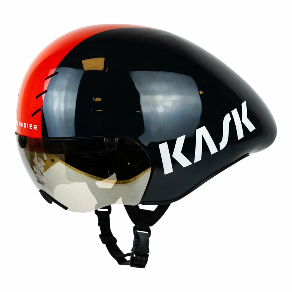 Kask Beluga Time trial helmet by Ineos Grenadiers is as aerodynamic as possible due to the reduction in air resistance that occurs when riding. The helmet provides ample protection during the fall since no rider can safely stay in the same position for the entire race.
